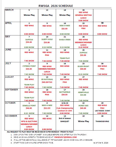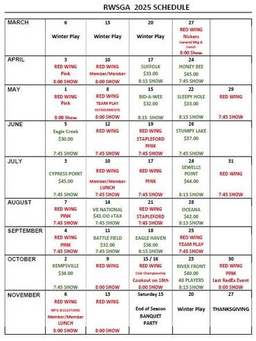 GENTLEMEN!! Be advised that handicaps shown on the above Web sight are for Red Wing Lake golf course only. Also, players handicaps will be updated the FIRST AND 15TH OF EVERY MONTH ONLY. Your handicap may vary slightly on the different courses that we play.